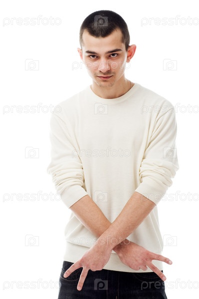 Молодой человек показывает знак с изолированными пальцами на белом фоне