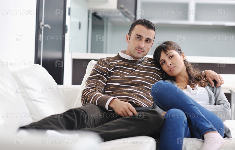 Молодая пара смотрит телевизор у себя дома в гостиной