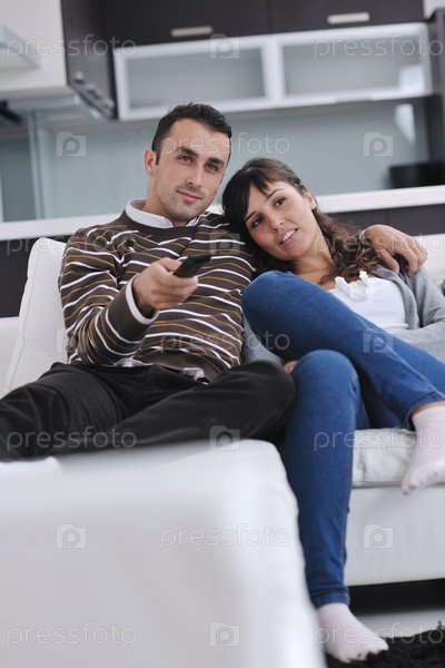 Молодая пара смотрит телевизор у себя дома в гостиной