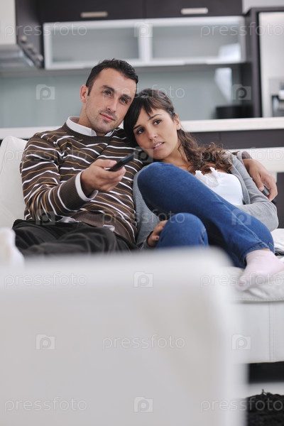 Молодая пара смотрит телевизор у себя дома в гостиной