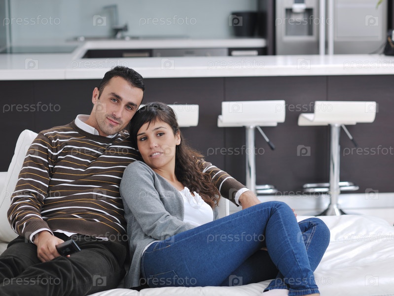 Молодая пара смотрит телевизор у себя дома в гостиной