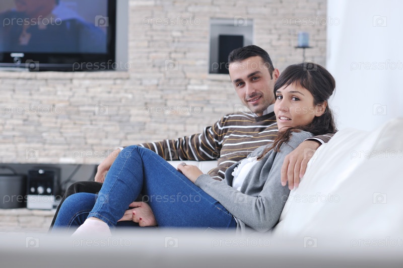Молодая пара смотрит телевизор у себя дома в гостиной