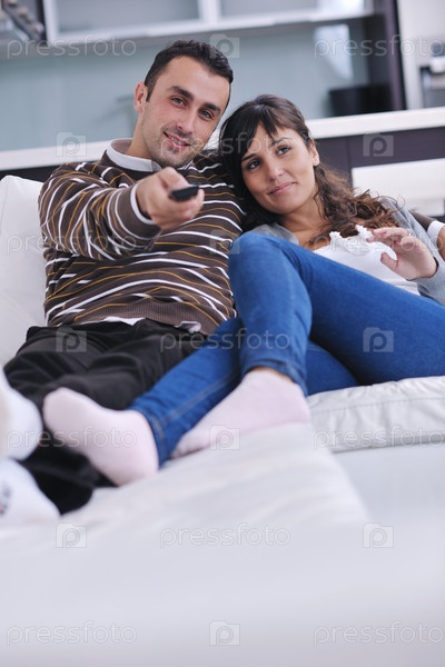 Молодая пара смотрит телевизор у себя дома в гостиной