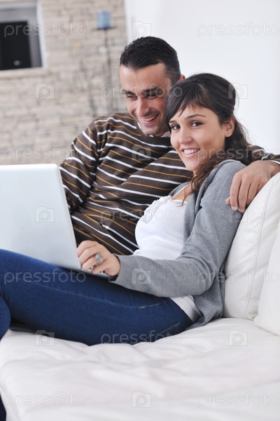 Счастливая пара работает на ноутбуке в современной гостиной
