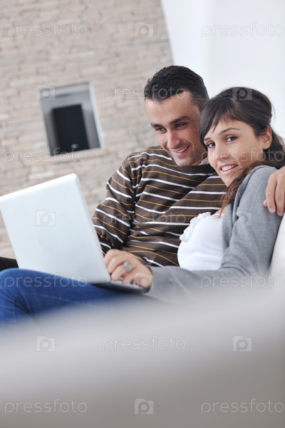 Счастливая пара работает на ноутбуке в современной гостиной