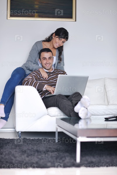 Молодая пара с ноутбуком в гостиной