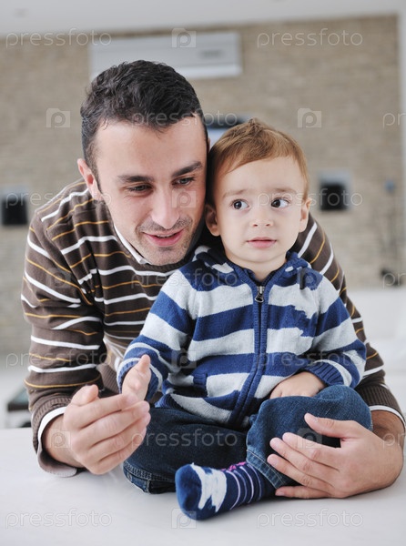 Портрет счастливого отца с сыном в домашней обстановке