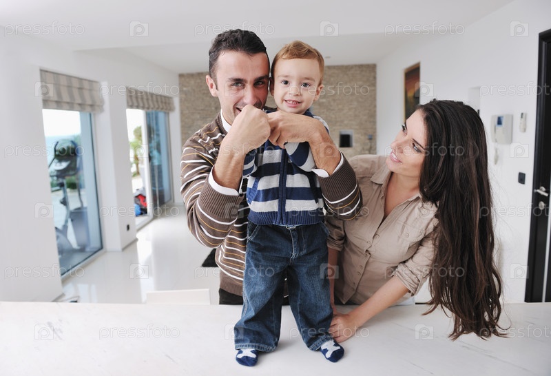 Счастливая молодая семья отдыхает в новом доме