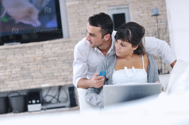 Молодая пара с ноутбуком в домашней обстановке