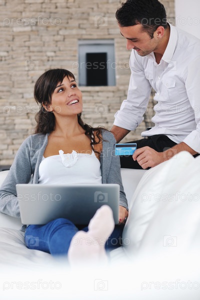 Счастливая пара с ноутбуком в современной гостиной
