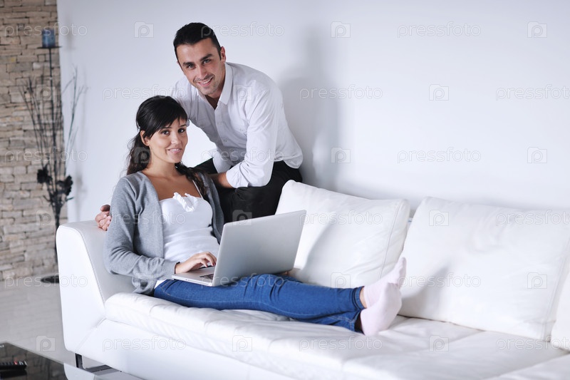 Молодая пара с ноутбуком в домашней обстановке