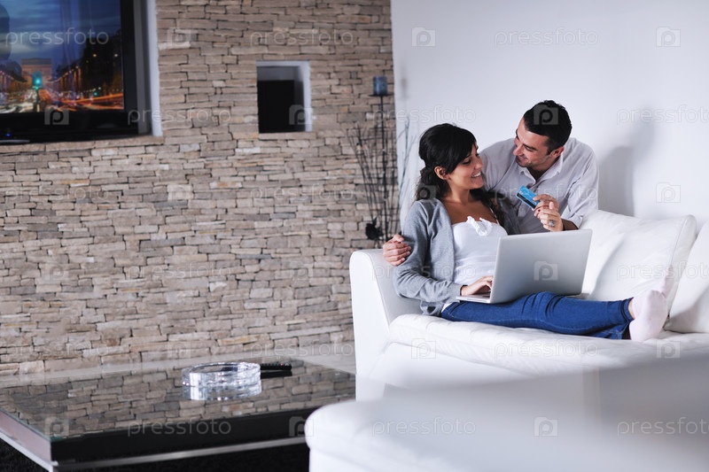 Молодая пара с ноутбуком в современной гостиной