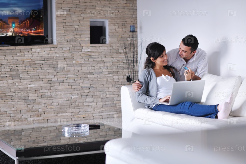 Молодая пара с ноутбуком в современной гостиной