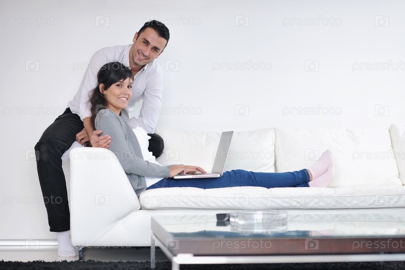 Молодая пара с ноутбуком в домашней обстановке