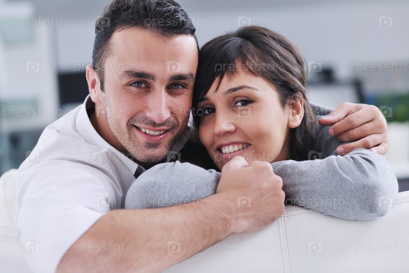 Счастливая молодая пара отдыхает в современной гостиной
