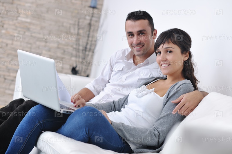 Счастливая пара с ноутбуком в современной гостиной