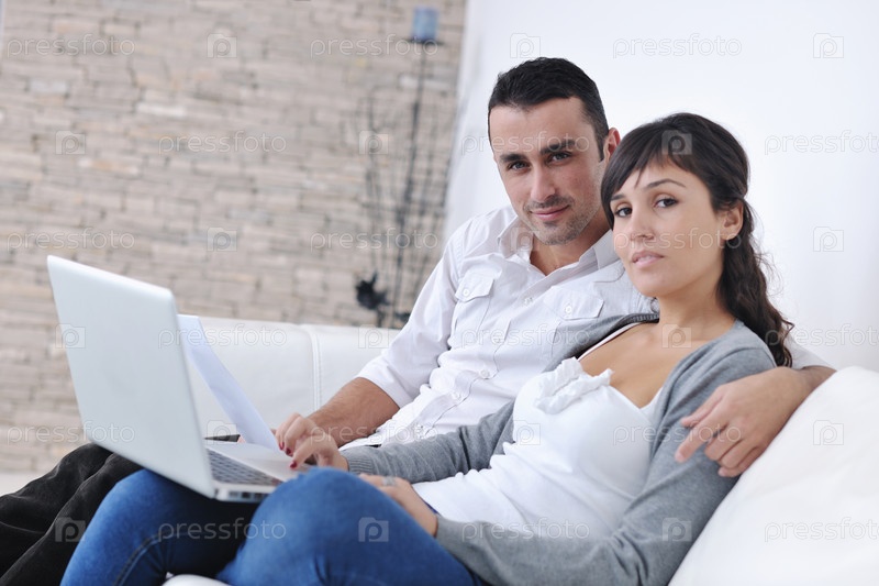 Счастливая пара с ноутбуком в современной гостиной