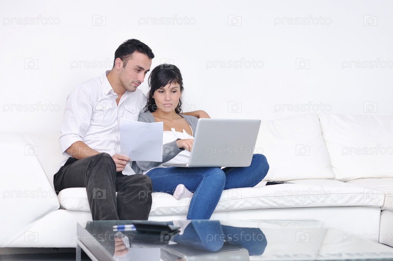 Счастливая пара с ноутбуком в современной гостиной