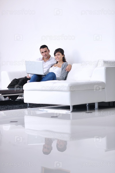 Счастливая пара с ноутбуком в современной гостиной