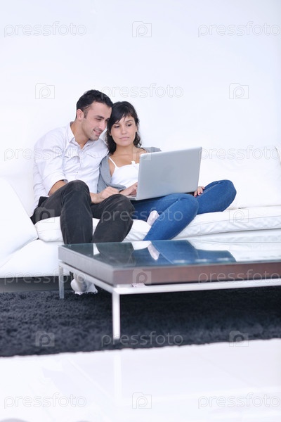 Молодая пара с ноутбуком дома в гостиной