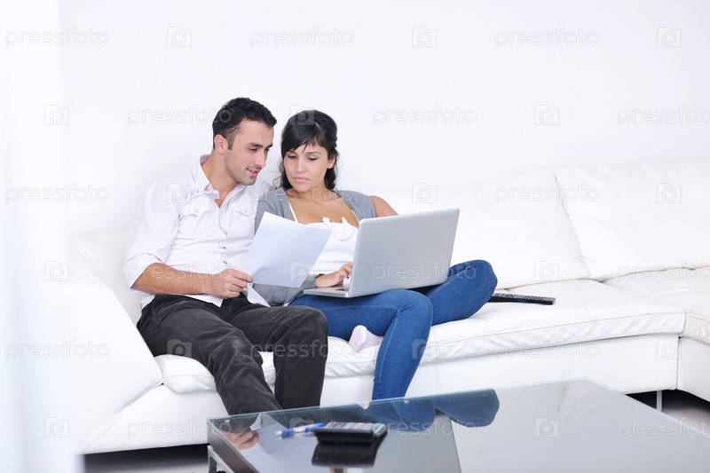 Молодая пара с ноутбуком дома в гостиной