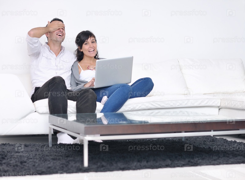 Счастливая молодая пара с ноутбуком дома в гостиной