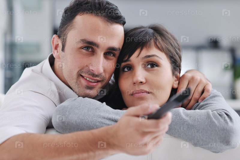 Молодая пара смотрит телевизор у себя дома в гостиной