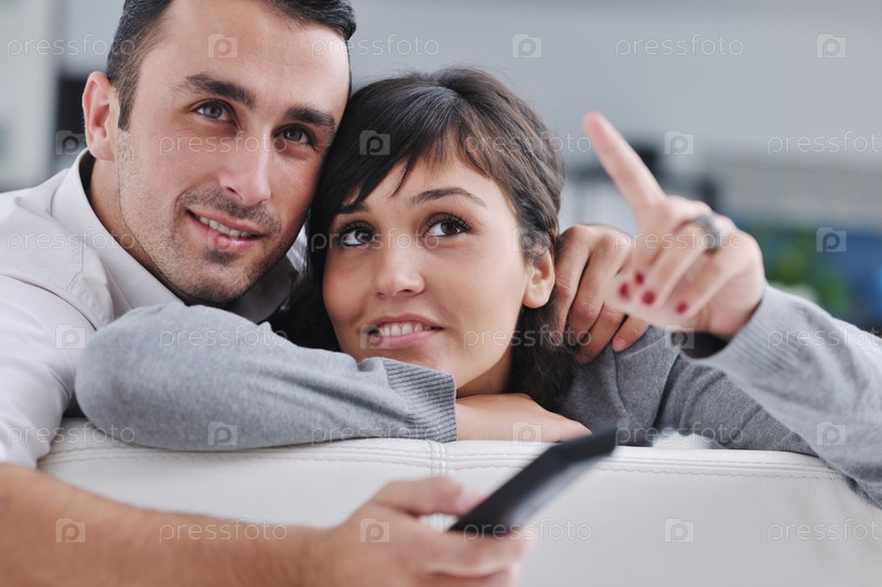 Молодая пара смотрит телевизор у себя дома в гостиной