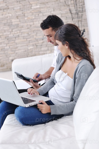 Счастливая пара с ноутбуком в современной гостиной