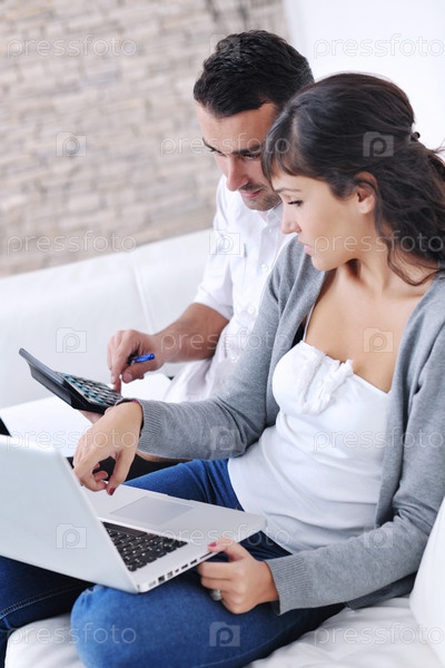 Счастливая пара с ноутбуком в современной гостиной