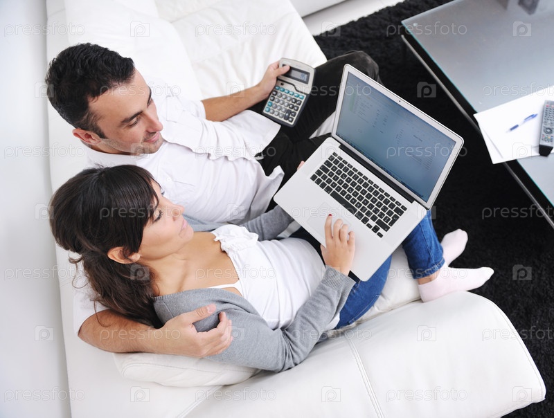 Молодая пара с ноутбуком и калькулятором в домашней обстановке