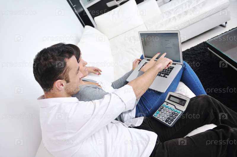 Молодая пара с ноутбуком и калькулятором в домашней обстановке