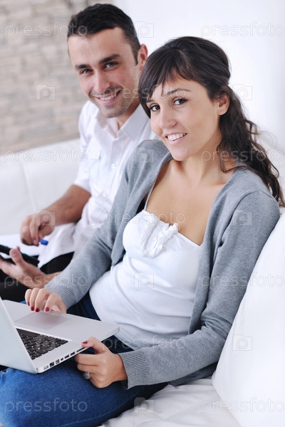 Молодая пара с ноутбуком и калькулятором в домашней обстановке