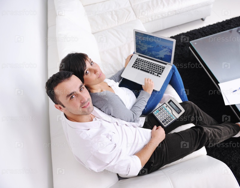 Молодая пара с ноутбуком и калькулятором в домашней обстановке