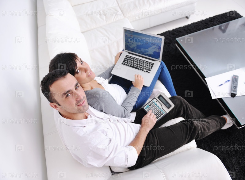 Молодая пара с ноутбуком и калькулятором в домашней обстановке