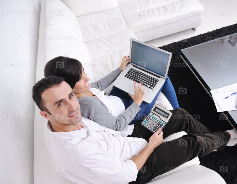 Молодая пара с ноутбуком и калькулятором в домашней обстановке