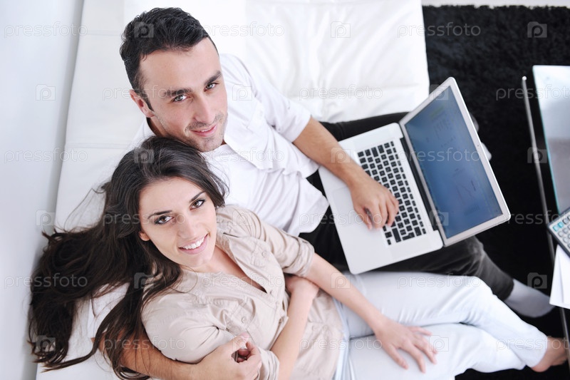 Молодая пара с ноутбуком в современной гостиной