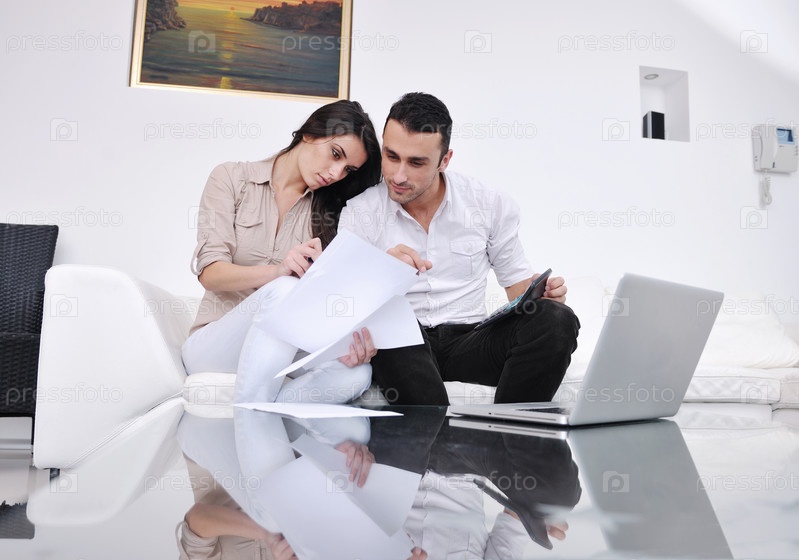 Молодая пара с ноутбуком работает в домашней обстановке