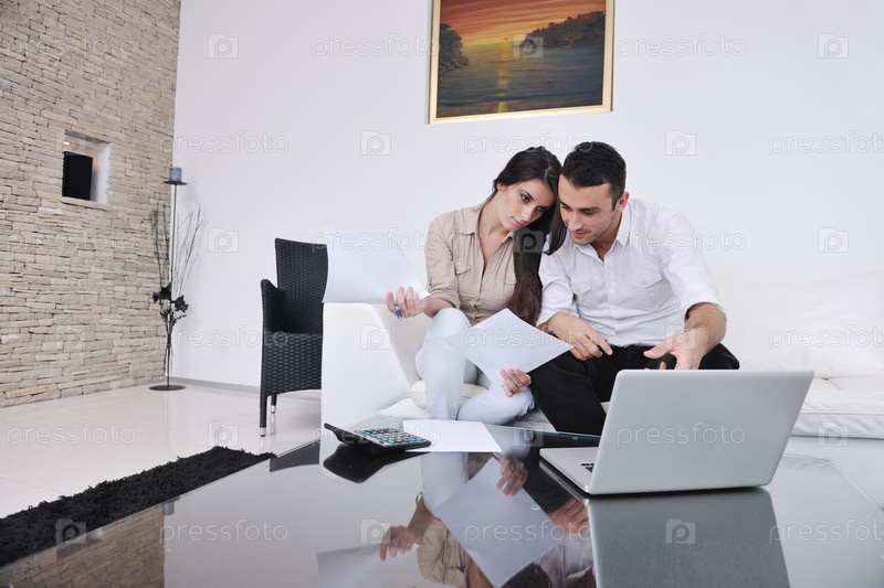 Молодая пара с ноутбуком работает дома в современной гостиной