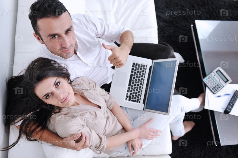 Молодая пара с ноутбуком работает в домашней обстановке