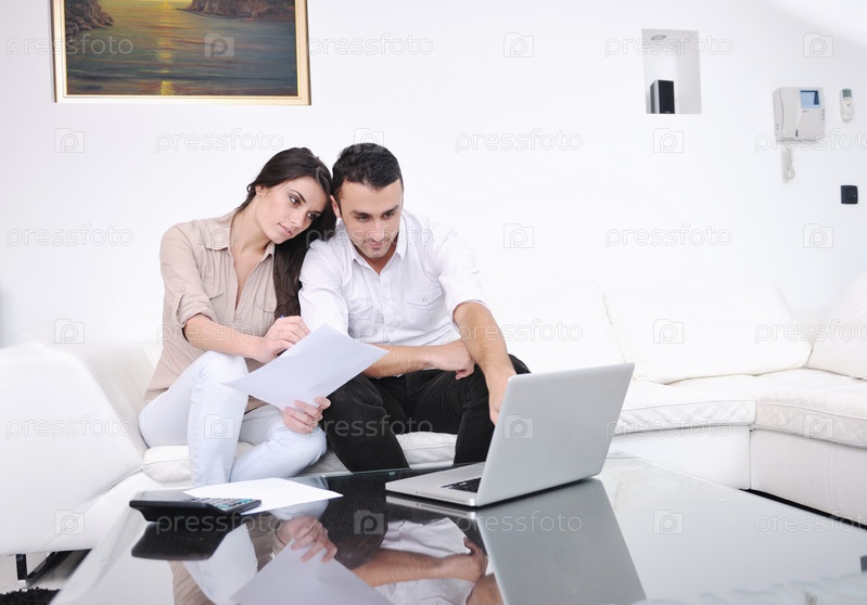 Молодая пара с ноутбуком работает дома в современной гостиной