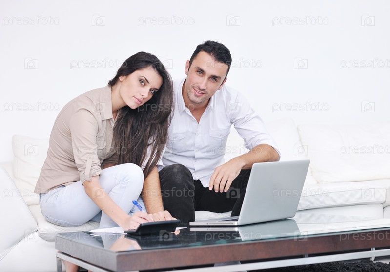 Молодая пара с ноутбуком в современной гостиной