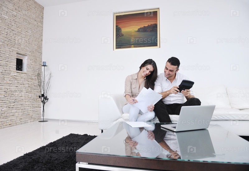 Молодая пара с ноутбуком в современной гостиной