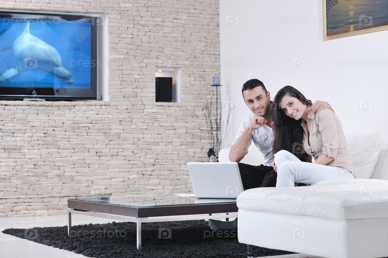 Молодая пара с ноутбуком в современной гостиной