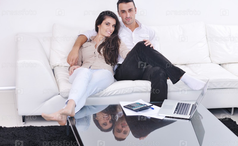 Молодая пара с ноутбуком в современной гостиной