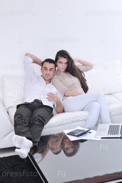 Молодая пара с ноутбуком в современной гостиной