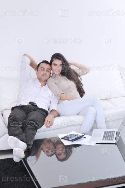 Молодая пара с ноутбуком в современной гостиной