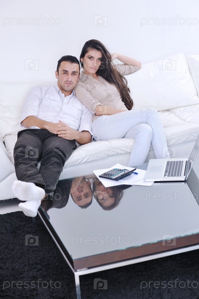 Молодая пара с ноутбуком в современной гостиной