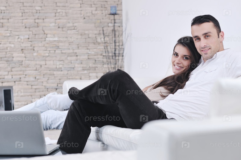 Молодая пара с ноутбуком в современной гостиной