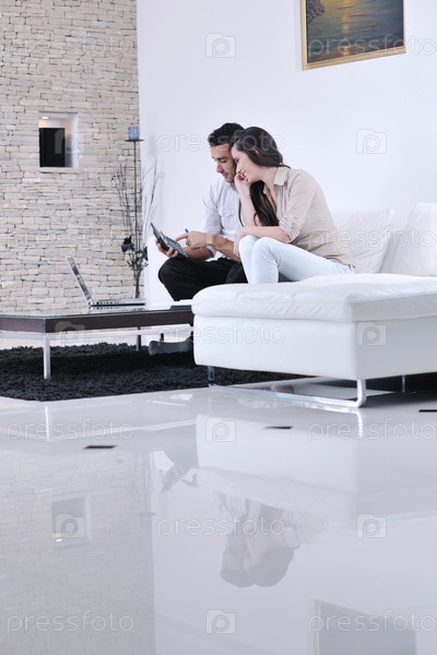 Молодая пара с ноутбуком и калькулятором в современной гостиной